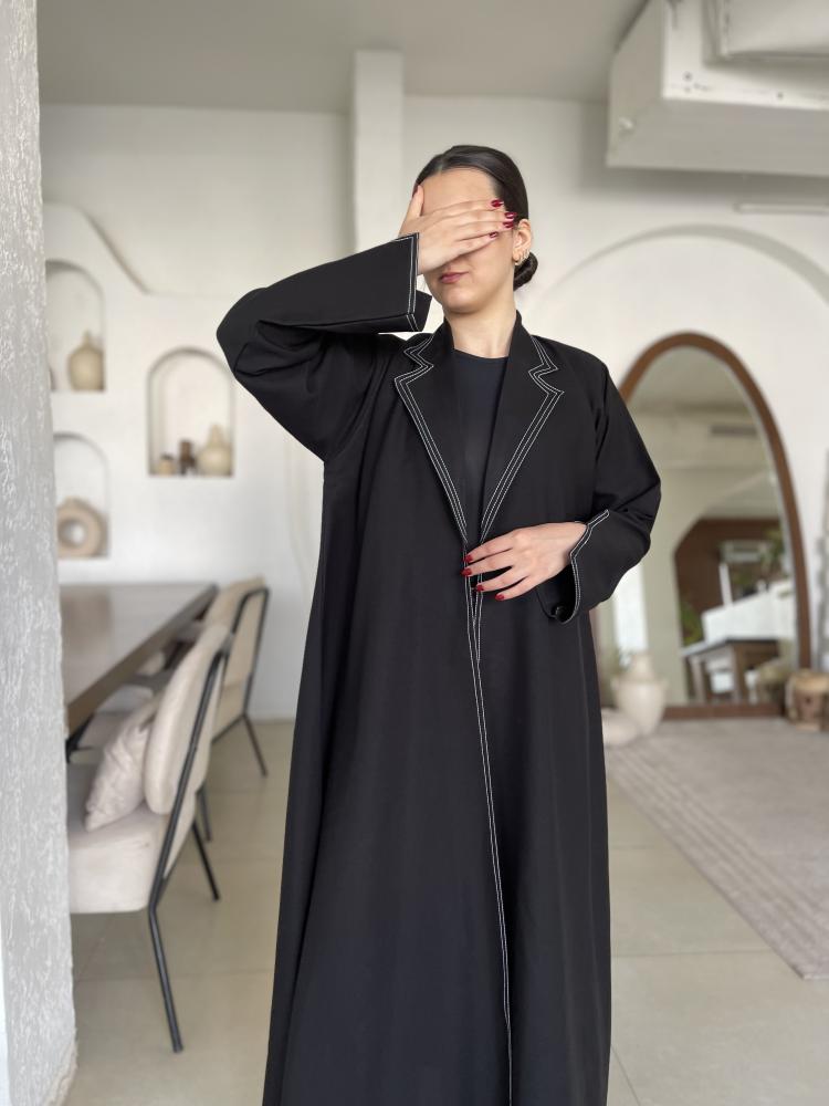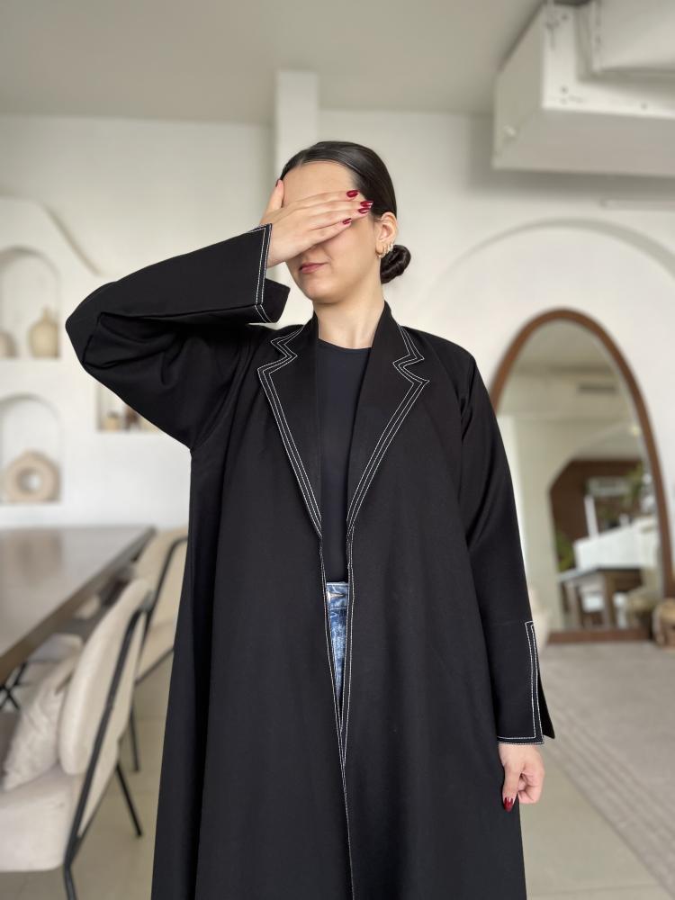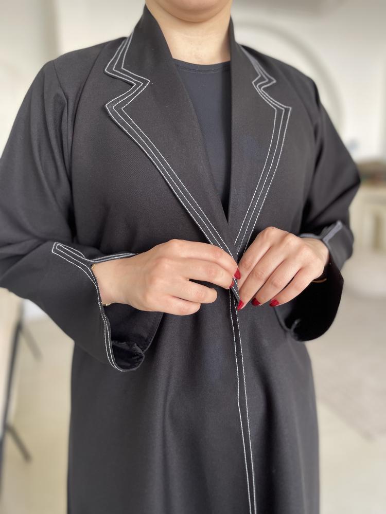 بليزر محدد بدقة باللون الأبيض القماش : كتان اسود عملي مايحتاج كوي الموديل : بليزر - نص كلوش محددة اطراف العباية بدقة باللون الأبيض الطرحة : شيفون اسود مع طرف بدقة باللون الأبيض .