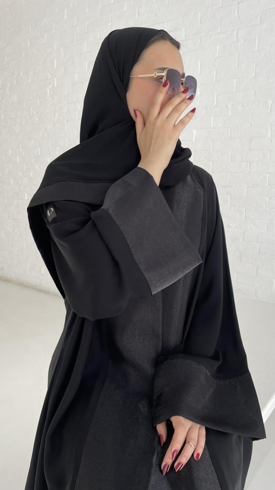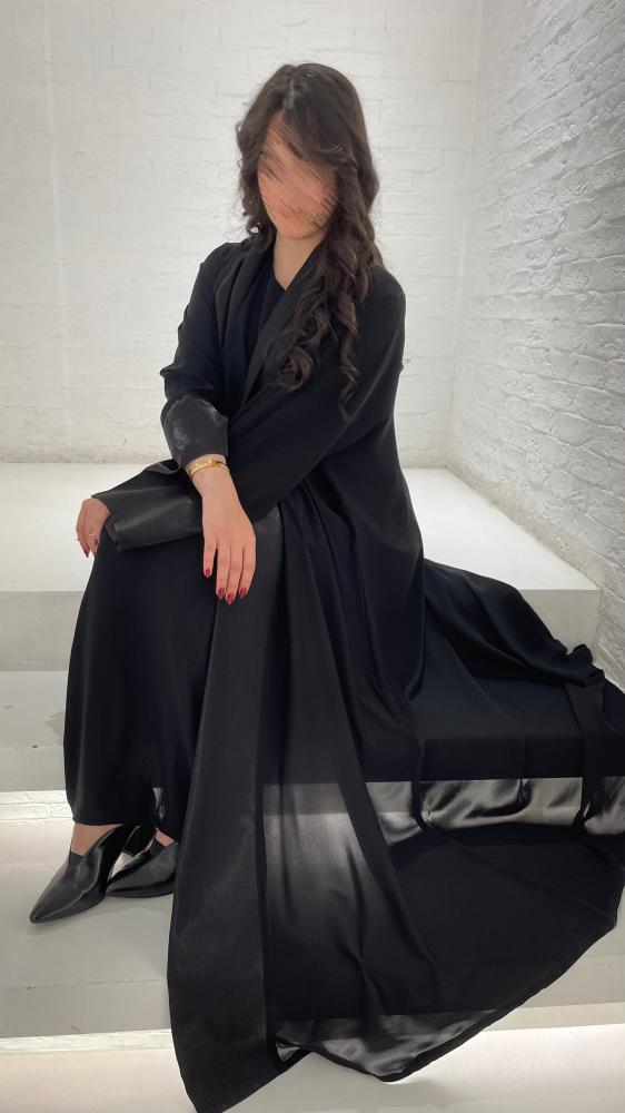 - القماش : كريب ماي فير ليدي ، سواده فاحم ، عملي ( لايحتاج الى كوي ) ، ناعم وطايح ، مع لاميه اسود 🪄 .
