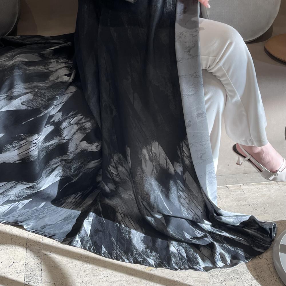 - القماش : جاكار ناعم شبيه الحرير مموج باللون الأسود مع الرمادي🪄 .